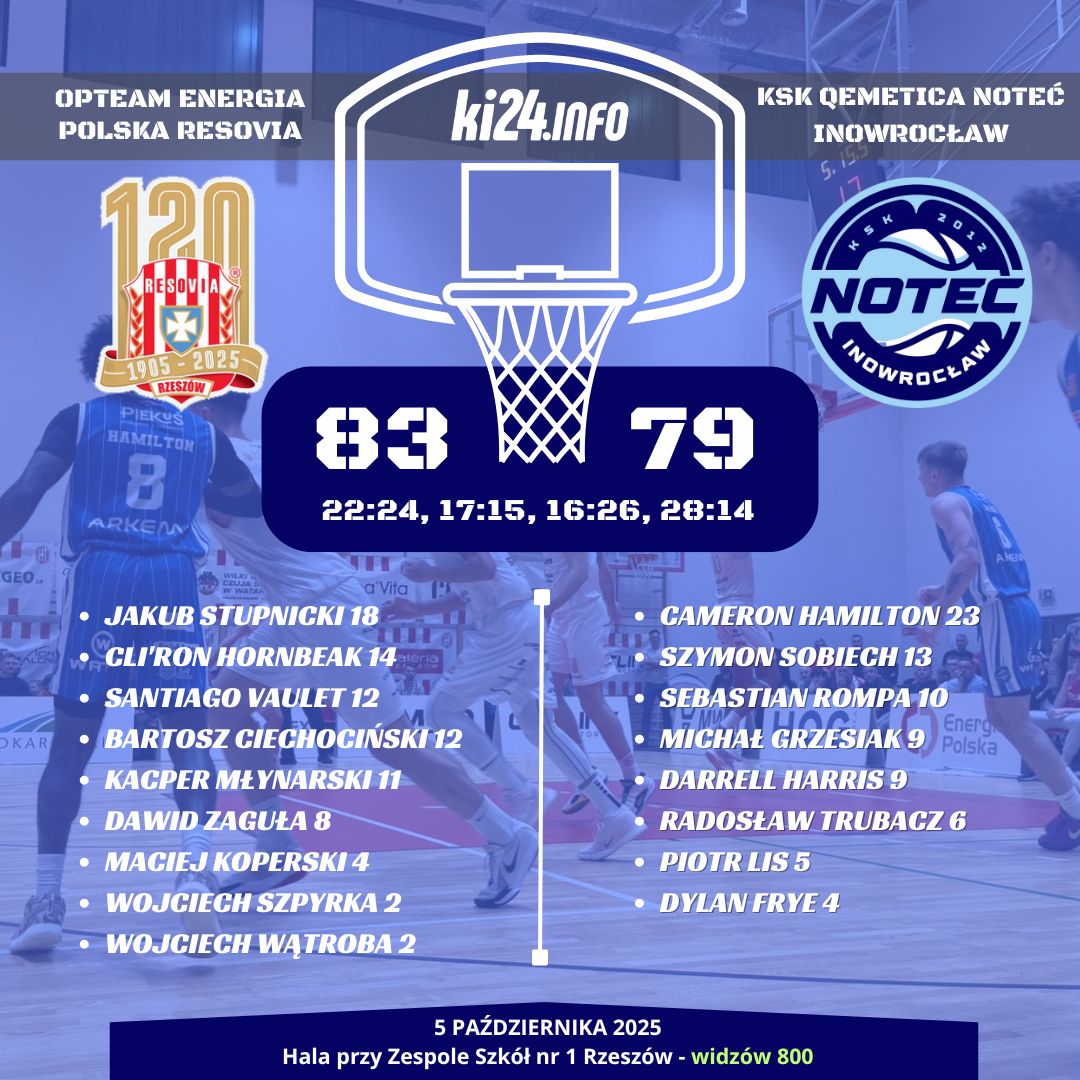 W sobotnim meczu koszykarze Resovii Rzeszów podejmowali KSK Qemetica Noteć Inowrocław. Niewiele brakowało, by Biało-Niebiescy wrócili z Rzeszowa z wygraną. Niestety, fatalna ostatnia kwarta sprawiła, że Noteć przegrała.