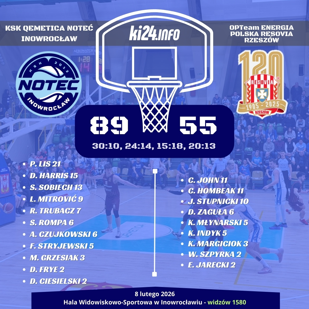 W ramach 23. kolejki Pekao S.A. 1. ligi biało-niebiescy podejmowali OPTeam Energia Polska Resovię Rzeszów. Na zwycięstwo w Inowrocławiu nasza drużyna czeka od 22 listopada 2025 roku. Goście to drużyna w zasięgu naszych, ale ten sezon pokazał już, że zdarzyć się może wszystko. Niedziela, 8 lutego przyniosła przełamanie - Noteć pewnie pokonała Resovię. Wkrótce relacja z meczu i galerie.