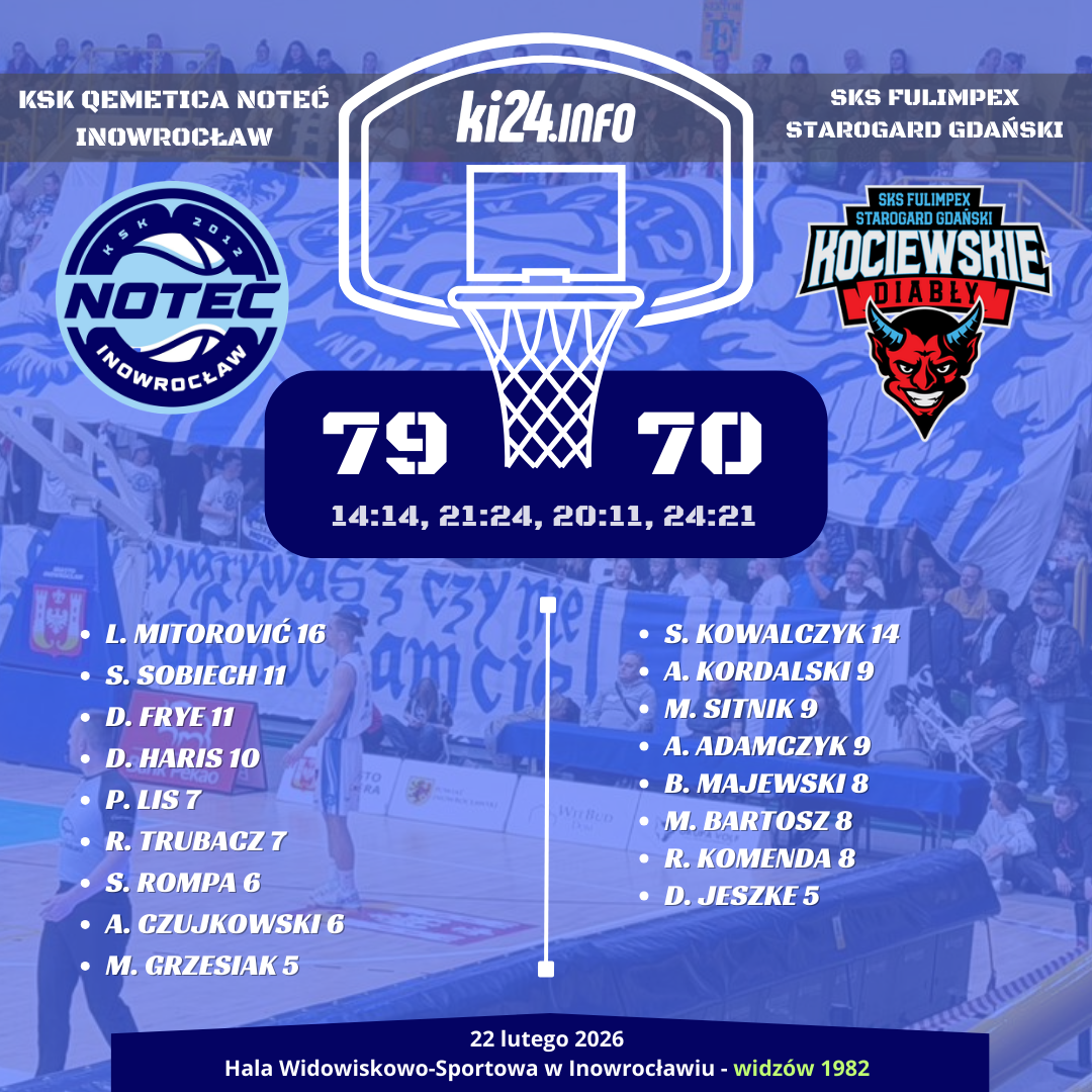 25. kolejka rozgrywek koszykarskiej I ligi przyniosła spotkanie KSK Qemetica Noteci Inowrocław z wiceliderem SKS Fulimpex Starogard Gdański. Biało-Niebiescy w ostatnich meczach nieco oddalili się od strefy spadkowej, ale mecz z drugą drużyną ligi, nie zapowiadał się jak spacerek.