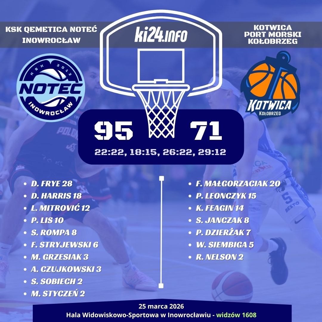 W ostatnim spotkaniu w Inowrocławiu w tym sezonie KSK Qemetica Noteć zmierzyła się z Kotwicą Portem Morskim Kołobrzeg. Dla naszych, pojedynek z dobrze dysponowanym przeciwnikiem, miał szczególne znaczenie. Noteć wciąż walczy o utrzymanie w szeregach pierwszoligowców. W środowy wieczór Biało-Niebiescy nie zawiedli i pokonali gości.