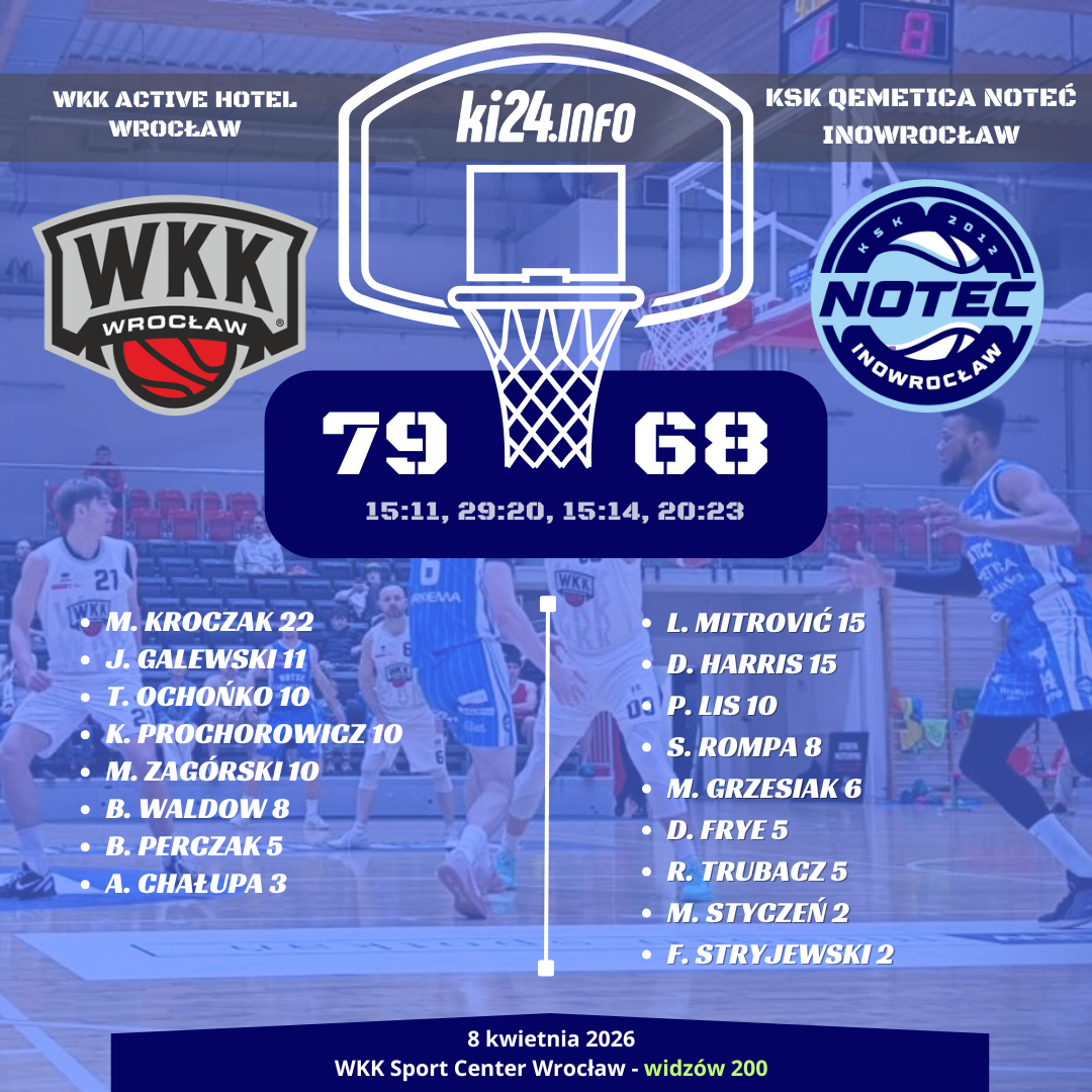 W meczu 31. kolejki koszykarskiej I ligi KSK Qemetica Noteć Inowrocław pojechała do Wrocławia na spotkanie z WKK Active Hotel. Obie drużyny przed tym starciem zajmowały sąsiednie miejsca w tabeli, co zapowiadało wyrównaną rywalizację i otwarty wynik.