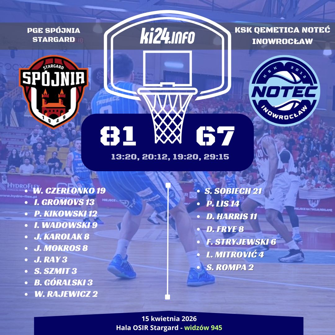 KSK Qemetica Noteć Inowrocław rozegrała ostatni mecz sezonu 2025/26 na wyjeździe, mierząc się z PGE Spójnią Stargard. Starcie z jednym z najsilniejszych zespołów 1. ligi zakończyło się porażką Biało-Niebieskich 67:81, choć inowrocławianie przez długi czas toczyli wyrównaną walkę.