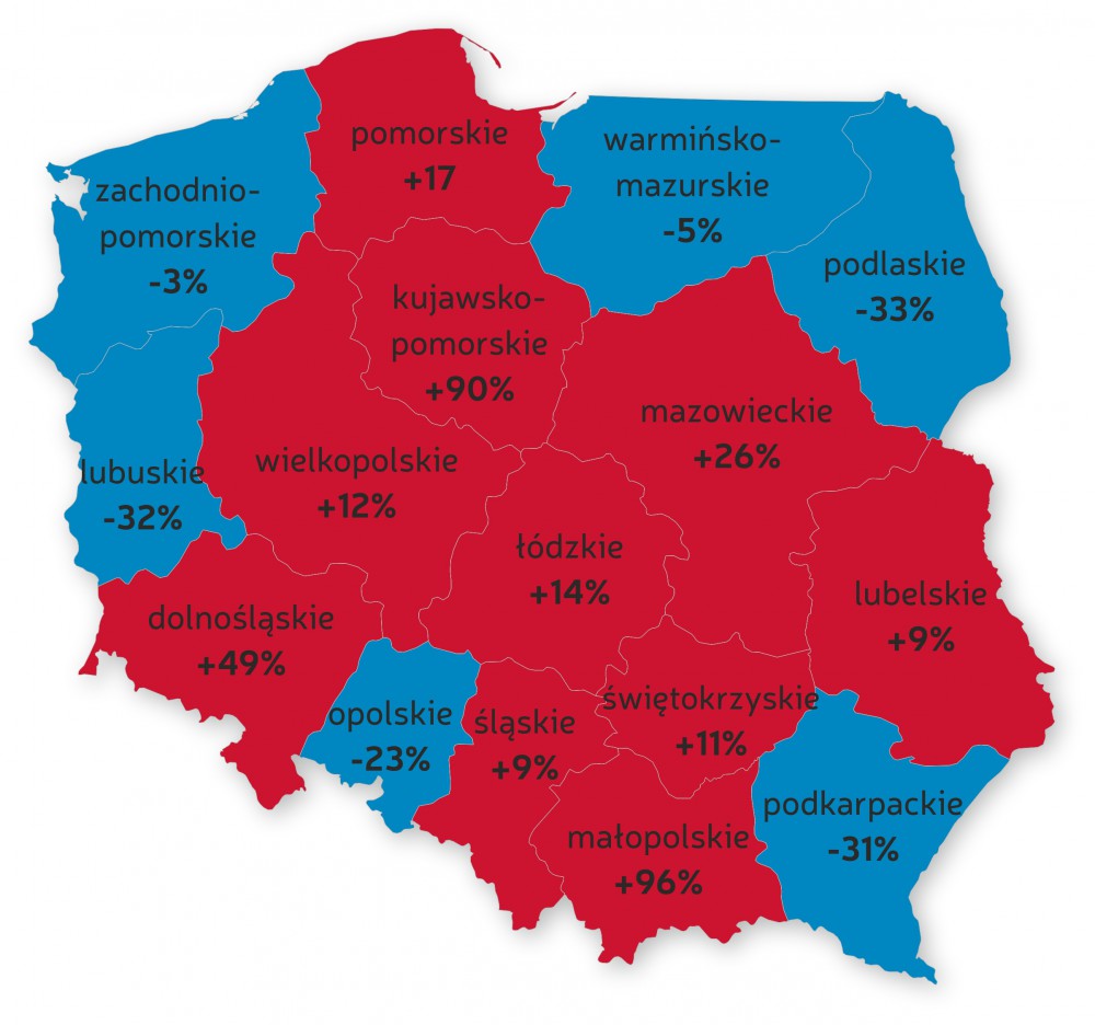 Rys.1. Procentowy wzrost/spadek łącznej wartości zadłużenia biur podróży w okresie od 01.06.2015 r. do 01.06.2016 r. w podziale na poszczególne województwa.