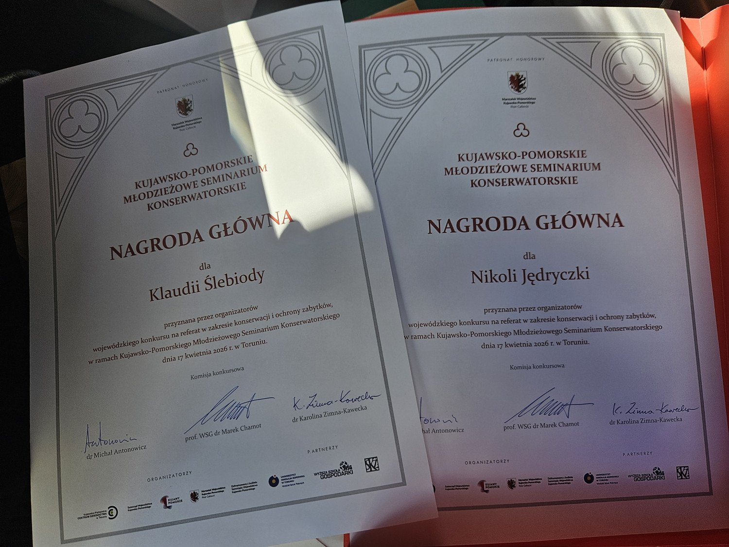 Nagroda główna trafiła do Nikoli Jędryczki i Klaudii Ślebiody z Zespołu Szkół Budowlanych w Inowrocławiu, uczennic kierunku technik renowacji elementów architektury. Zwyciężyły dzięki referatowi pt. „Rekonstrukcja bryły wapiennej bazy wczesnogotyckiej z dawnego kościoła Franciszkanów w Inowrocławiu”.
