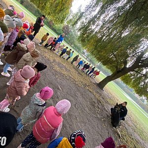 Przedszkolaki poznały postawę „żółwia”, którą należy zastosować w przypadku ataku zwierzęcia. Dzięki niej zapewnimy maksimum bezpieczeństwa, gdyż pozwala na osłonięcie znacznej powierzchni ciała.