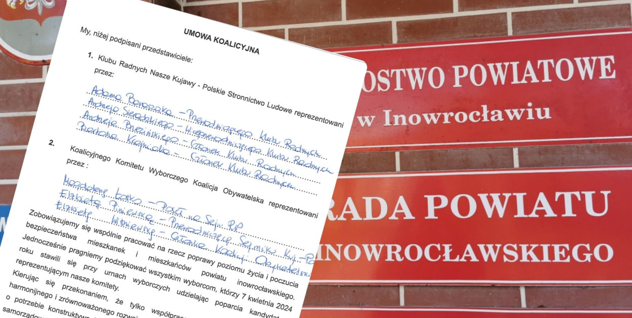 Umowę koalicyjną podpisali Adam Banaszak, Andrzej Sieradzki, Andrzej Brzeziński i Bartosz Krajniak, a po drugiej stronie Koalicję Obywatelską reprezentowali Magdalena Łośko, Elżbieta Piniewska i Elżbieta Wiśniewska, która jako radna KO, nie przystąpiła do koalicji z PiS (podobnie postąpił Wiesław Kończal). O tym jak miał wyglądać Powiat Inowrocławski informowaliśmy dwa tygodnie temu.