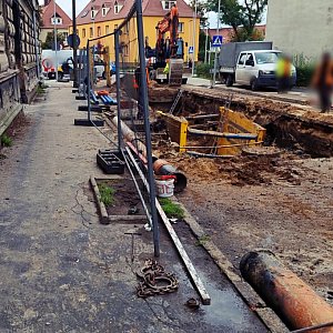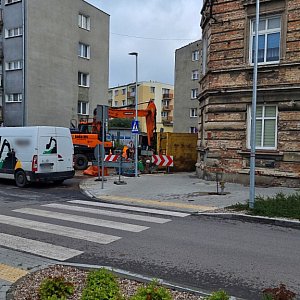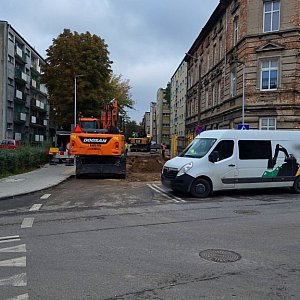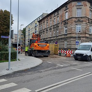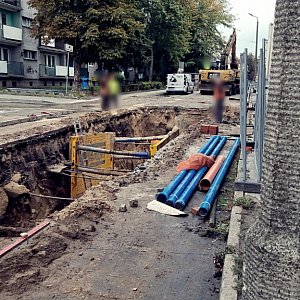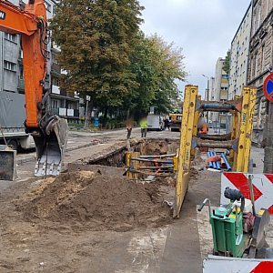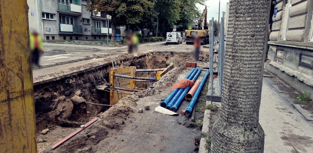W tym miejscu budowana jest sieć wodociągowa oraz kanalizacja sanitarna wraz z przyłączami. W tej chwili w sąsiedztwie skrzyżowania z ul. Wawrzyniaka, w jezdni powstał sporych rozmiarów wykop i prowadzone są roboty.