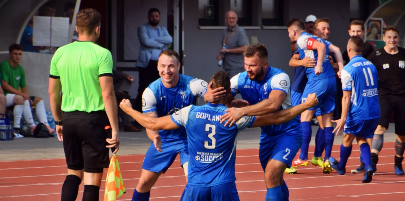 Grająca o jedną klasę rozgrywkową wyżej Cuiavia już w 10. minucie została zaskoczona przed Dominika Kostrzaka. Obrońca Goplanii po rzucie wolnym i zamieszaniu pod bramką Cuiavii, zachował najwięcej zimnej krwi i strzelił pierwszą bramkę. Biało-Zieloni, mimo sporego zaskoczenia utratą gola, konsekwentnie grali swoje i w 41. minucie meczu do wyrównania doprowadził Mikołaj Błaszczyk. Tuż przed zakończeniem pierwszej części spotkania na listę strzelców wpisał się ponownie Błaszczyk.