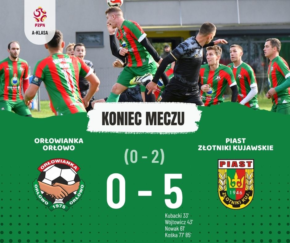 Ósma kolejka rozgrywek A-klasy przyniosła jednostronne widowisko w Orłowie. Orłowianka podejmowała Piasta Złotniki Kujawskie i choć przed pierwszym gwizdkiem to gospodarze byli stawiani w roli minimalnego faworyta, bo rywale zamykali tabelę, to wydarzenia na boisku przyniosły zupełnie inny obraz.