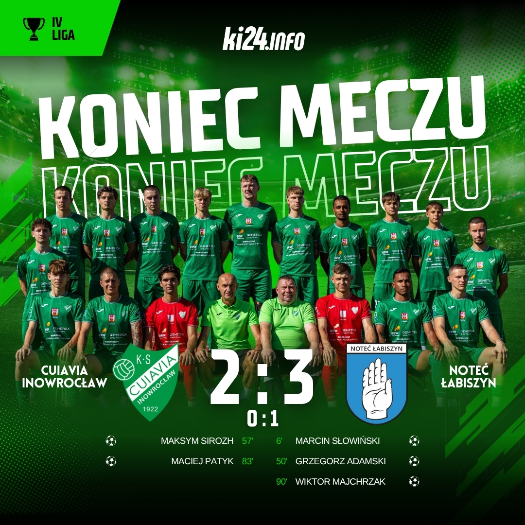 • Niestety, Cuiavia musiała uznać wyższość Noteci - przy remisie 2:2 zwycięskiego gola dla przyjezdnych strzelił były kapitan Cuiavii Wiktor Majchrzak.