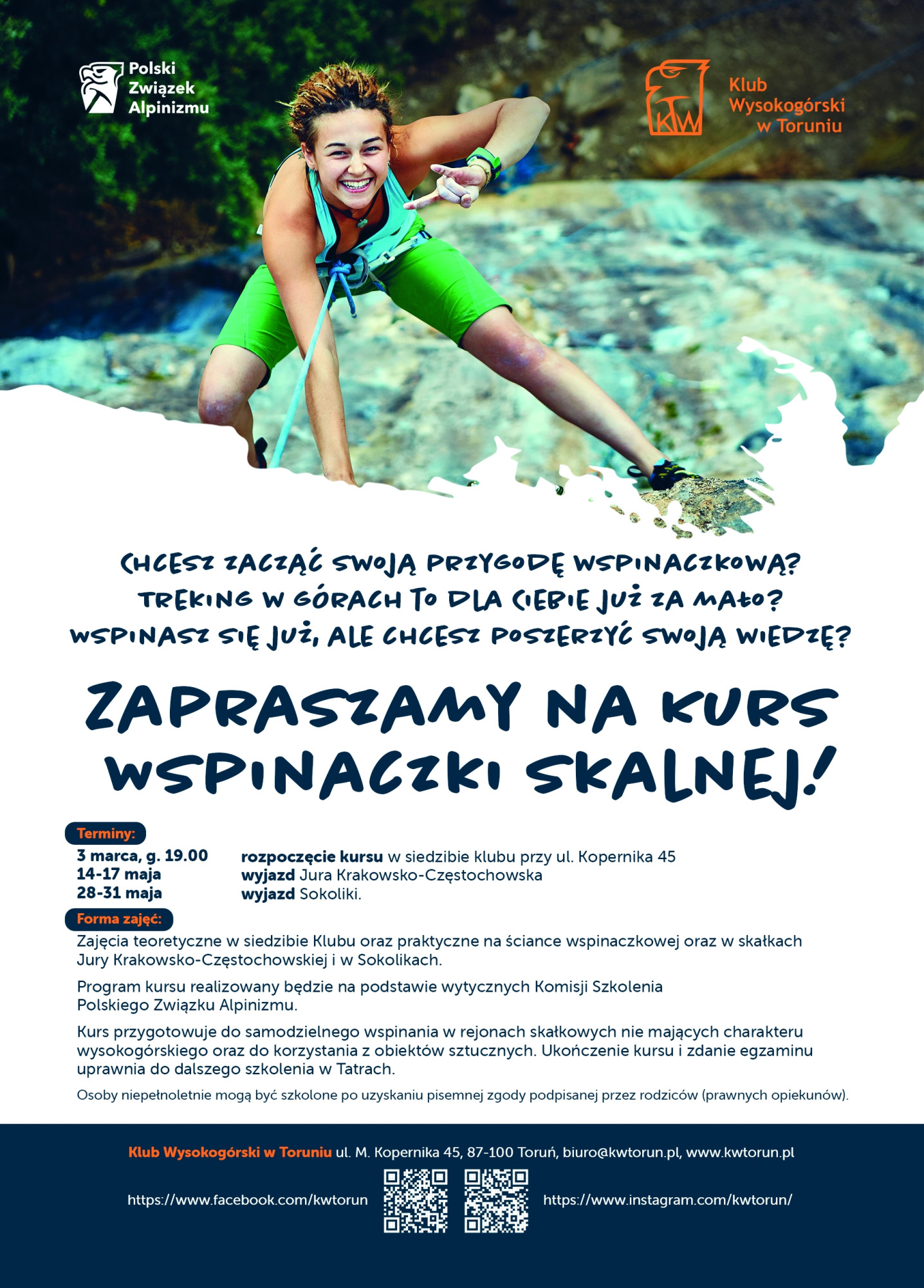 Wspinaczka to sport dostępny dla każdego, niezależnie od wieku czy poziomu sprawności. Jednak prawdziwa swoboda w skałach zaczyna się tam, gdzie kończy się przypadek, a zaczyna wiedza i umiejętności. Kurs organizowany przez toruński Klub Wysokogórski gwarantuje, że poznasz zasady bezpiecznej asekuracji, nauczysz się budować stanowiska, korzystać z własnego sprzętu oraz działać odpowiedzialnie w terenie skalnym.