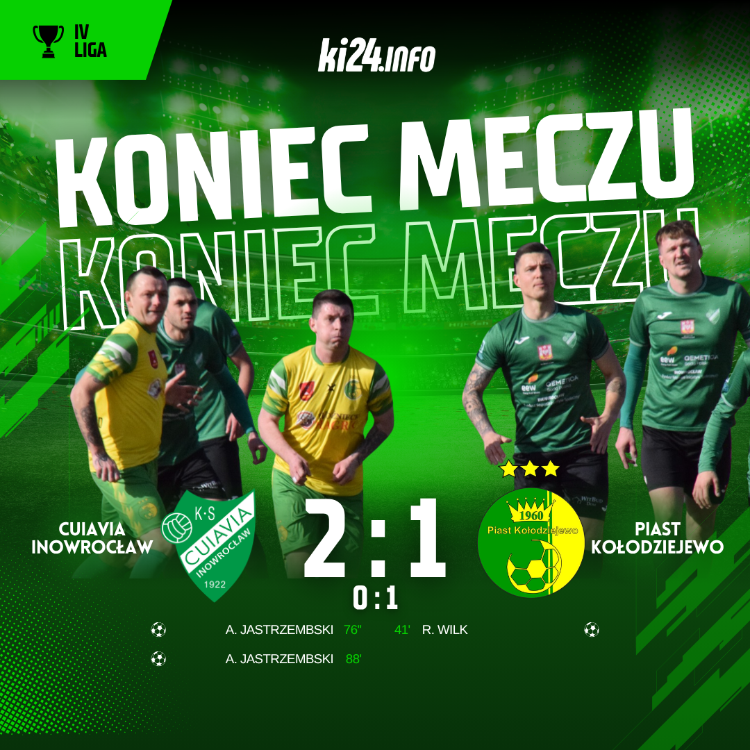 22. kolejka rozgrywek IV ligi. Cuiavia Inowrocław walczyła o punkty z Piastem Kołodziejewo. Obie drużyny zajmują lokaty w dolnej części tabeli, więc zwycięstwo w sobotnim pojedynku i jednym i drugim pozwalało na złapanie oddechu i ucieczkę z okolic strefy spadkowej. Bohaterem i antybohaterem spotkania w jednym - okazał się Ariel Jastrzembski, który strzelił dwie bramki. Kapitan Biało-Zielonych złapał też dwie żółte i w konsekwencji czerwoną kartkę.