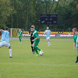 Od początku inicjatywę przejęli Biało-Zieloni, którzy częściej utrzymywali się przy piłce i zepchnęli do defensywy graczy Naprzodu. Groźne strzały z dystansu oddali kolejno: Dariusz Słupski i Norbert Mielcarek - niestety oba niecelne. Goście czekali natomiast na okazję do kontrataku - a gdy nadarzyła się już taka, to niedokładnie rozgrywali piłkę. Minuty mijały, a na tablicy wyników wciąż widniał bezbramkowy remis. To zmieniło się jednak po półgodzinie gry. Cuiavia wykonywała wówczas rzut rożny, z którego dośrodkowywał Michał Kruszczyński, a do główki najwyżej wyskoczył Wiktor Majchrzak, który celnym trafieniem otworzył wynik spotkania. Do końca pierwszej połowy gra toczyła się głównie w środku pola i po pierwszych 45 minutach inowrocławianie skromnie prowadzili z niżej notowanym rywalem - 1:0.
