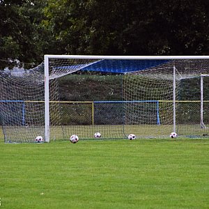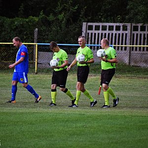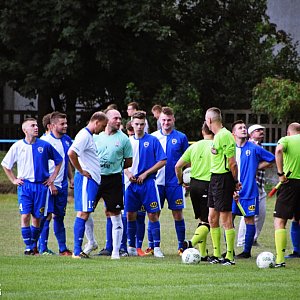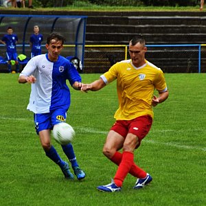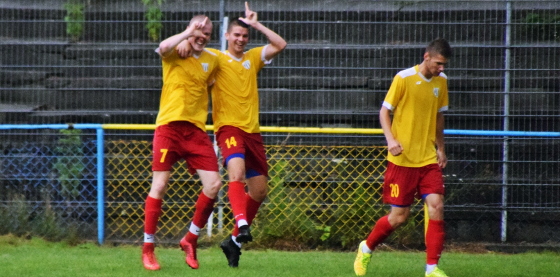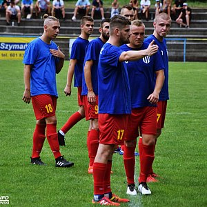 Strzelanie rozpoczął Dominik Kostrzak, który w 25. minucie w świetnym stylu główką pokonał bramkarza gości. Dwie minuty później na listę strzelców wpisał się aktywny od początku meczu Michał Hałas. Wydawać by się mogło, że dwubramkowa przewaga wprowadzi spokój w szeregi Biało-Niebieskich i wynik utrzyma się do przerwy. Niestety, kilka minut przed końcem tej części meczu, niepewnie interweniował bramkarz gospodarzy i było 2:1.