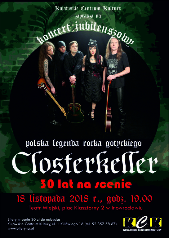 Czołowy przedstawiciel gotyckiego rocka na polskiej scenie muzycznej zespół Closterkeller 18 listopada o godz. 19.00 wystąpi w Teatrze Miejskim. Kultowa już formacja świętuje w tym roku 30-lecie nieprzerwanej działalności.