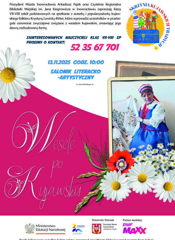 Prezydent Miasta Inowrocławia Arkadiusz Fajok oraz Czytelnia Regionalna Biblioteki Miejskiej im. Jana Kasprowicza w Inowrocławiu zapraszają klasy VII-VIII szkół podstawowych na spotkanie z autorką i popularyzatorką kujawskiego folkloru Krystyną Lewicką-Ritter, która wprowadzi uczestników w przebogate ceremonie zwyczajowe związane z weselem kujawskim, omawiając jego dawną rozbudowaną formę.
