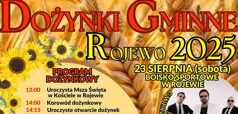 Barwny korowód, lokalne zespoły folklorystyczne, konkursy, nagrody, a wieczorem występ gwiazdy – tak zapowiadają się Dożynki Gminne w Rojewie, które odbędą się w sobotę 23 sierpnia na boisku sportowym. Na mieszkańców i gości czeka całodniowe świętowanie z tradycją i dobrą zabawą.