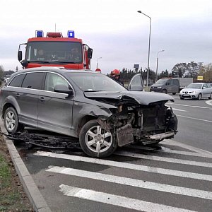 Audi Q7 i ford focus zderzyły się na skrzyżowaniu ulic Prymasa Glempa i Wojska Polskiego. Oba pojazdy zostały uszkodzone, kierowca forda zabrany został do szpitala. Policja wyjaśnia przebieg zdarzenia.