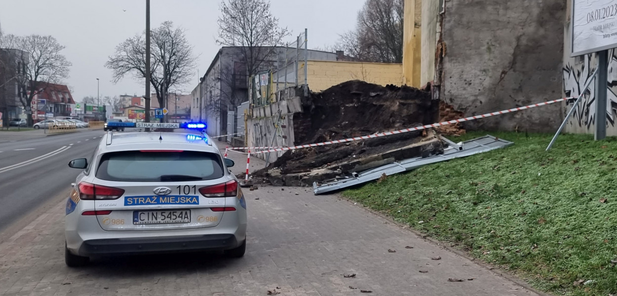 Uszkodzony został też przylegający do ściany billboard reklamowy. W tej chwili teren został zabezpieczony, a na miejscu jest straż miejska, która dozoruje miejsce zdarzenia. Trwa oczekiwanie na nadzór budowlany.