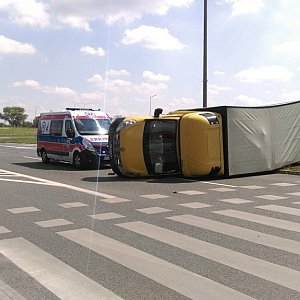 - Ciężarówka staranowała jeden samochód osobowy i wskutek uderzenia przewróciła się na bok.