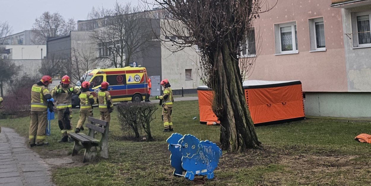 Na miejscu są dwa zastępy straży pożarnej, policja i zespół ratownictwa medycznego. Strażacy rozstawili skokochron.