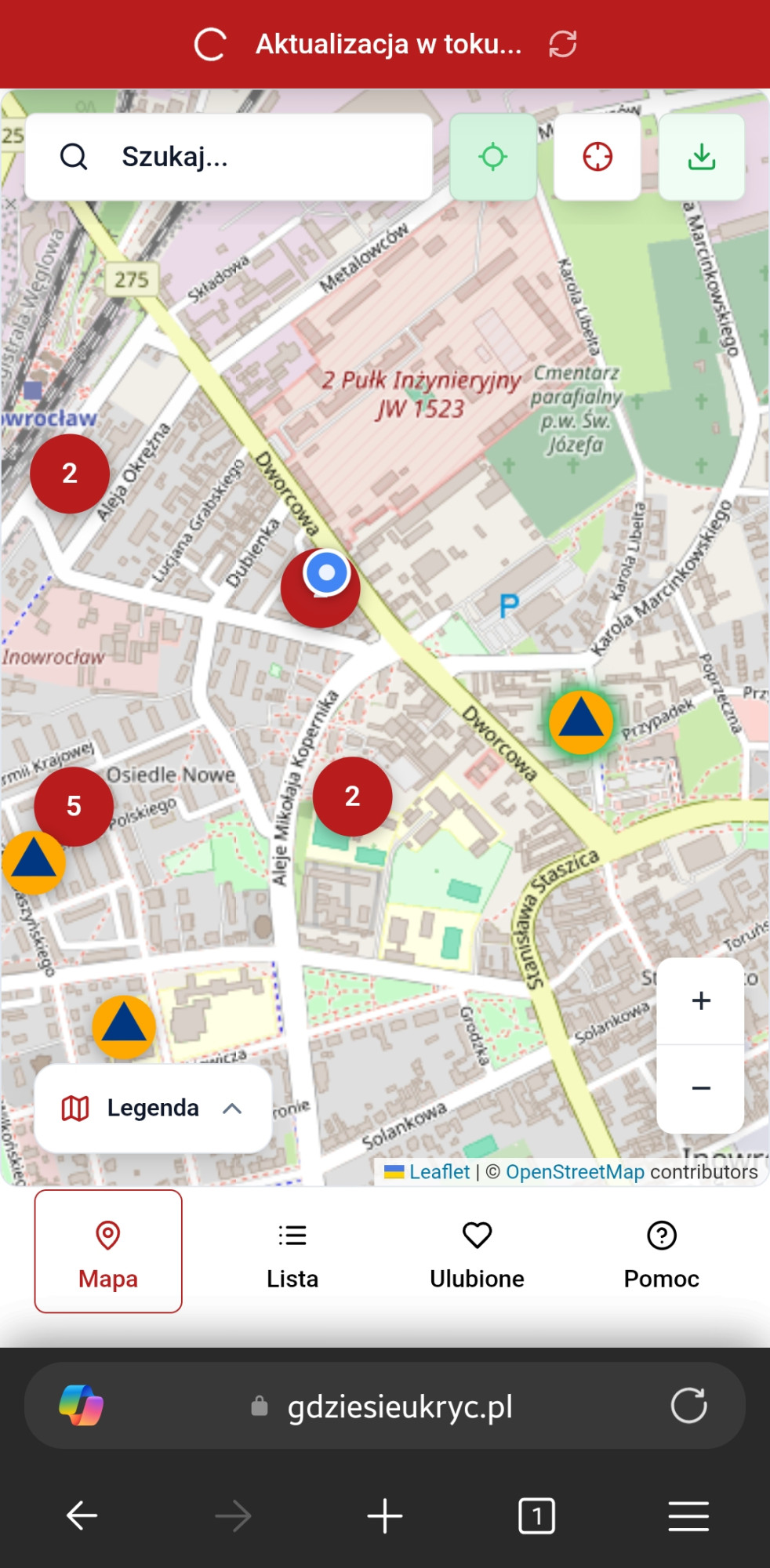 Aplikacja nie wymaga pobierania ze sklepu — instaluje się ją bezpośrednio z przeglądarki jako aplikację na ekranie głównym. Aplikacja działa hybrydowo w trybie offline (po pierwszym uruchomieniu) — nie zamykaj jej, pozostaw działającą w tle, aby mieć dostęp do pomocy i pobranych punktów schronienia.
