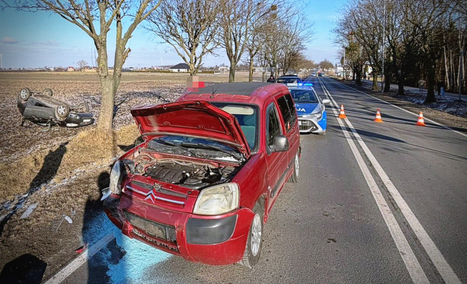 Po uderzeniu Fiat zjechał na przeciwny pas ruchu, gdzie doszło do kolejnego kontaktu – tym razem z Citroënem. Następnie samochód wypadł z drogi i dachował na pobliskim polu.