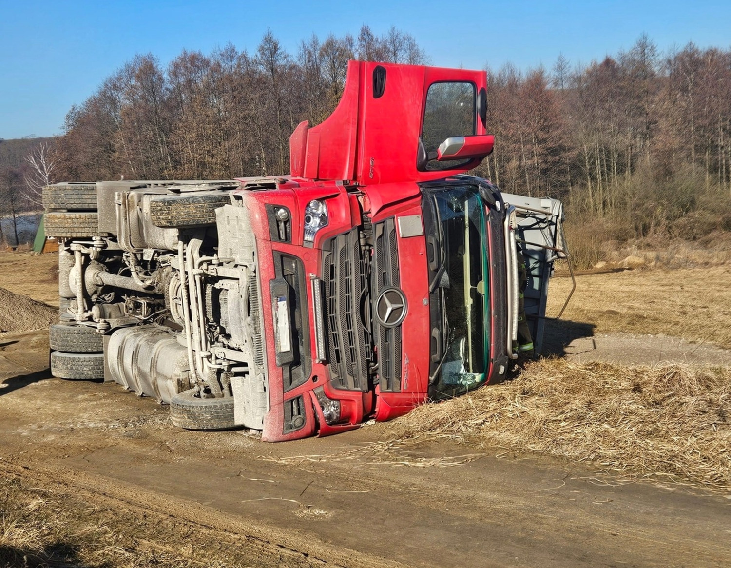 Na miejscu policjanci ustalili, że Mercedes Actros z naczepą typu „łódka” podczas pracy na polu ornym przewrócił się na bok w trakcie wysuwania tłoka hydraulicznego.