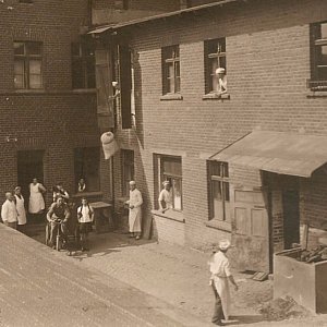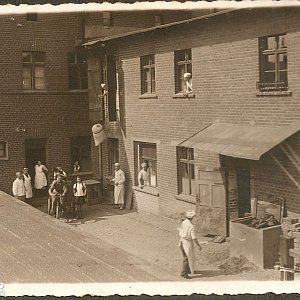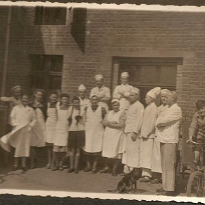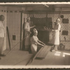 Fot. 1 i 2 - Pracownicy piekarni. Patrząc na zdjęcie-pierwszy po lewej - w białej marynarce - to wspomniany Niemiec-szef piekarni. Postać w oknie po prawej stronie-to mój teść Sylwester Serek.