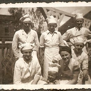 Fot. 3 - Polacy, załoga piekarni. Kobieta na zdjęciu to żona Niemca-szefa piekarni z synkiem. Przykucnięty po jej prawej stronie to mój teść.