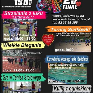 W Inowrocławiu już od wczoraj organizowane są imprezy towarzyszące tegorocznemu finałowi. Na sportowo zbiórkę pieniędzy rozpoczęto w hali przy ul. Rakowicza w Mątwach organizując strzelanie z łuku. Również koszykarska brać wspiera WOŚP - cały dochód z biletów z sobotniego meczu KSK Noteć przekazany zostanie na rzecz orkiestrowej fundacji. Przez cały dzień na obiektach Ośrodka Sportu i Rekreacji odbywać się będą akcje, z których dochód przeznaczony zostanie na WOŚP.