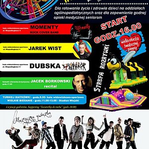 Od godziny 16.00 w hali widowiskowo-sportowej trwać będą koncerty i licytacje. Czynna będzie też strefa rozrywki dla dzieci. Na scenie zobaczymy coverową grupę Momenty, zaśpiewa też Jarek Wist, a gwiazdą będzie formacja Dubska. W Saloniku Literacko-Artystycznym chętni będą mogli wysłuchać recitalu Jacka Borkowskiego. Finałem będzie tradycyjne "Światełko do nieba", które zaplanowano na godz. 20.00.