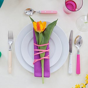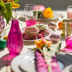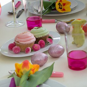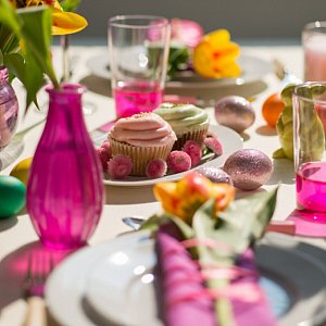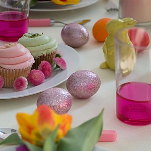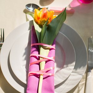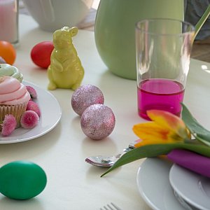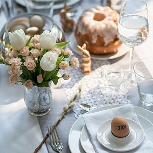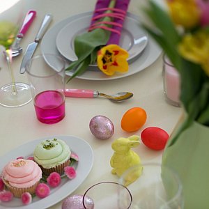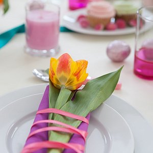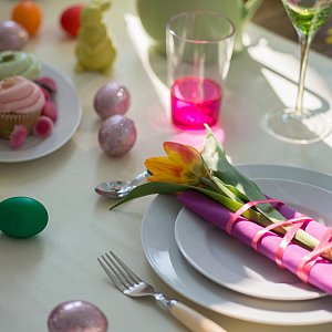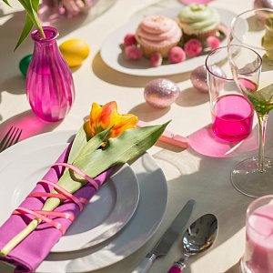 Wielkanoc to święto odradzającego się życia. Warto, by towarzyszący jej radosny nastrój, a także początek astronomicznej wiosny, znalazły swoje odbicie w wesołych dekoracjach na stole. Wielkanocny stół może być kolorowy! Niech na stole dominują barwy kojarzące się właśnie z wiosną, jak zieleń, żółć i błękit. Kolory te będą pięknie współgrać z różem i fioletem. Biały obrus nie jest elementem obowiązkowym, ale będzie stanowił idealne tło dla kolorowych dodatków. Niezbędne są też świeże kwiaty, najlepiej nieodłącznie kojarzące się z wiosną tulipany.