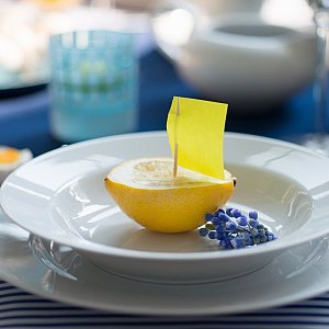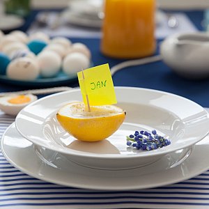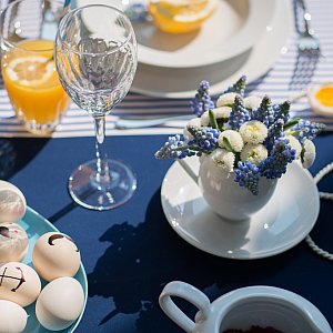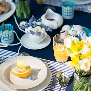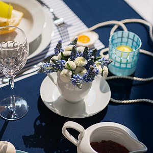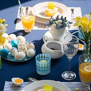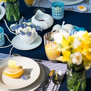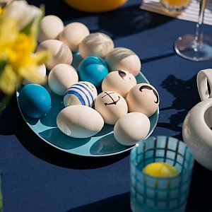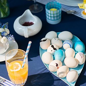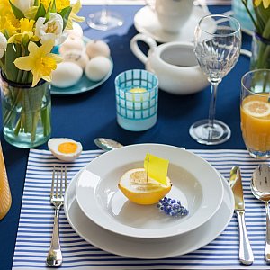 Obowiązkowym motywem stołu utrzymanego w stylu marine są paski, a kolorami dominującymi biały i niebieski. Ciemnogranatowy obrus będzie idealnie komponował się z podkładkami w biało-granatowe pasy. Biała zastawa doda stołowi elegancji, a dekoracje w postaci jaj w marynistyczne wzory przypomną, że mamy Wielkanoc! Aby nadać aranżacji wiosennego charakteru warto postawić na żółte dodatki. Wspaniale sprawdzą się w tej roli żółte żonkile.