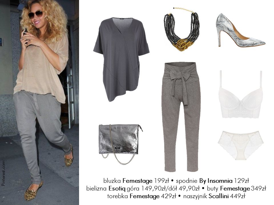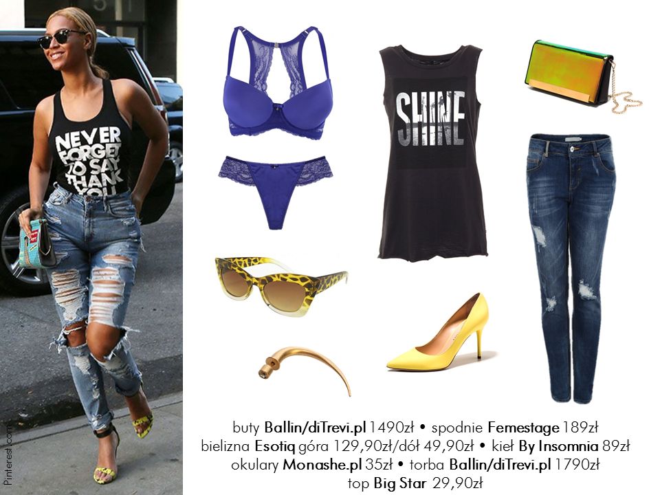 Na co dzień artystka uwielbia jeansy, marynarki i koniecznie szpilki od Balenciagi. Zakupy chętnie robi w Topshopie, w butiku Proenza Schouler oraz Givenchy. Jej ulubiony dodatek to torebki i duże kolczyki. Sprawdź, jakie zestawy przygotowaliśmy inspirując się stylem Beyonce.