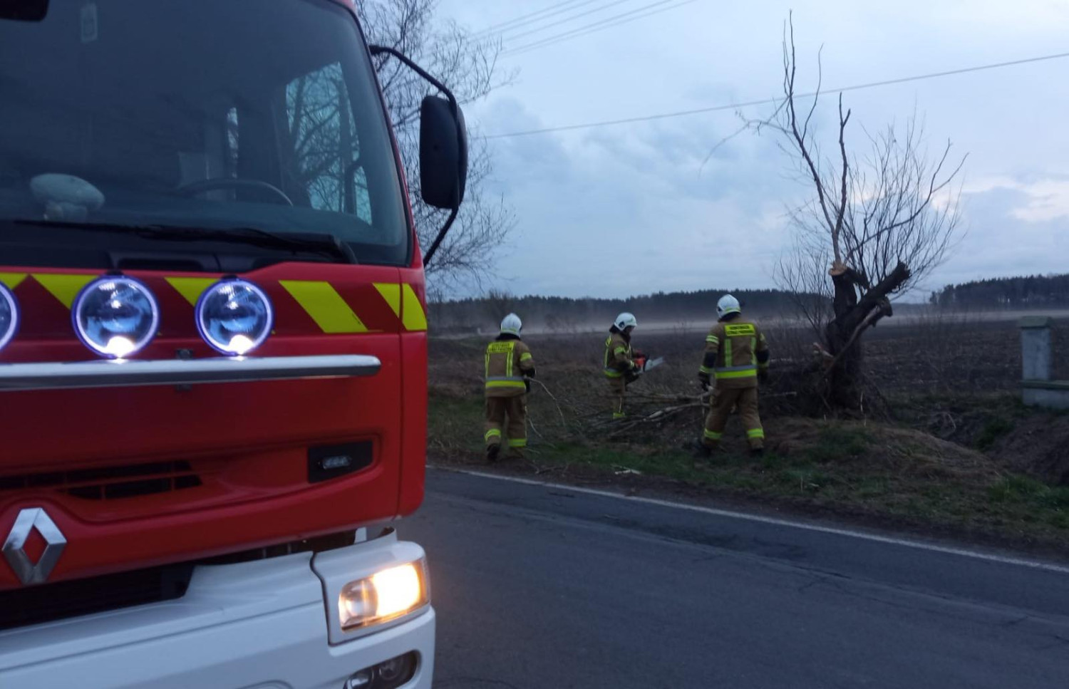 - W niedzielę wielkanocną około godziny 19 zostaliśmy zadysponowani do powalonego drzewa w miejscowości Stanomin. Po dotarciu na miejsce zastaliśmy wierzbę złamaną przez silny wiatr, której korona tarasowała jeden pas jezdni. Nasze działania polegały na pocięciu i usunięciu drzewa z drogi wojewódzkiej - relacjonują druhowie z OSP Dąbowa Biskupia.