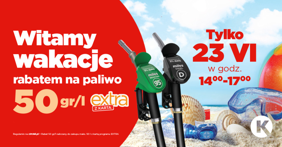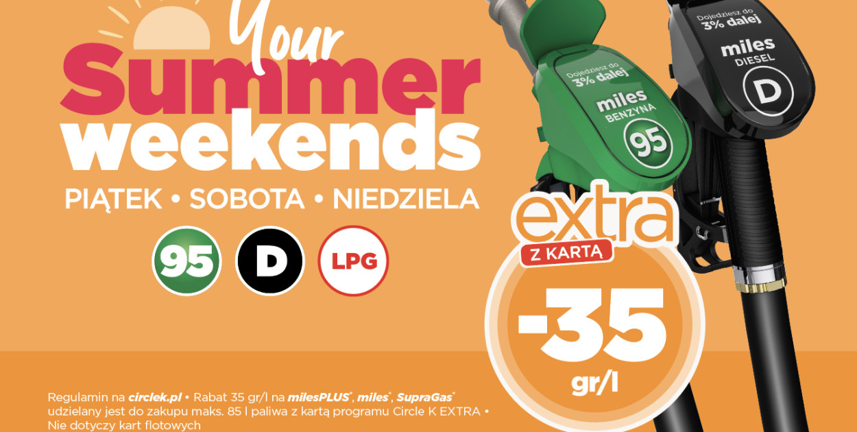 Wraz z rozpoczynającym się okresem wakacyjnym Circle K zaoferuje swoim klientom wyjątkowe zniżki na paliwo. Już 23 czerwca w godzinach od 14:00 do 17:00, w ramach akcji "Summer Day”, klienci będą mogli skorzystać z rabatu 50 gr/l na paliwa miles® oraz milesPLUS®. W kolejnych dniach zostanie uruchomiona akcja wakacyjna „Summer Weekends”, dzięki której pojawią się na stacjach kolejne rabaty, umożliwiające zakup wszystkich rodzajów paliw w niższych cenach. Z oferty będą mogli skorzystać posiadacze karty lojalnościowej EXTRA.