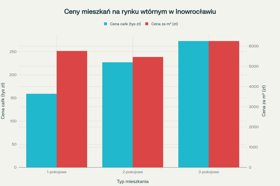 Na rynku wtórnym w Inowrocławiu mediana ceny mieszkania wynosi 256 500 zł przy medianie ceny za metr kwadratowy na poziomie 5 959 zł/m². Ceny wykazują znaczne zróżnicowanie w zależności od lokalizacji i standardu nieruchomości. Mieszkania 1-pokojowe można nabyć za medianę ceny 159 000 zł (5 759 zł/m²), mieszkania 2-pokojowe kosztują średnio 227 000-245 000 zł (5 462-6 250 zł/m²), podczas gdy mieszkania 3-pokojowe osiągają medianę 273 000 zł przy cenie za metr 6 250 zł/m².