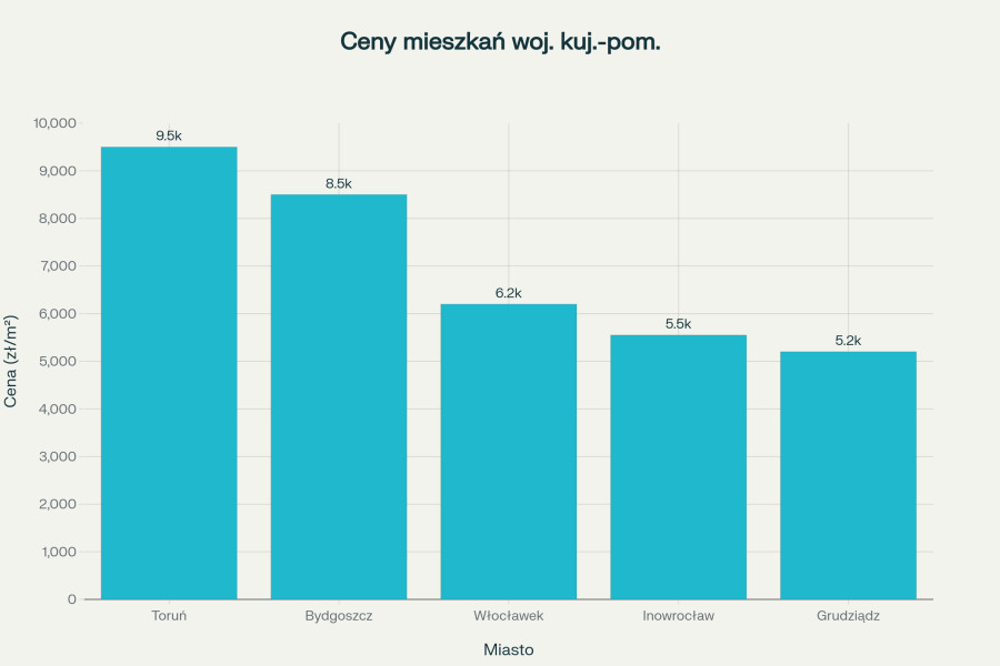 Inowrocław pod względem cen nieruchomości plasuje się w środkowej części stawki miast województwa kujawsko-pomorskiego, oferując doskonały stosunek jakości do ceny. Średnia cena za metr kwadratowy mieszkania wynosi około 5 550 zł/m², co lokuje miasto na trzeciej pozycji w regionie pod względem cenowym. Liderami cenowymi pozostają stolice województwa: Toruń z ceną około 9 500 zł/m² oraz Bydgoszcz z poziomem 8 500 zł/m², które jako największe ośrodki miejskie regionu charakteryzują się najwyższym popytem i najbardziej rozwiniętą infrastrukturą.