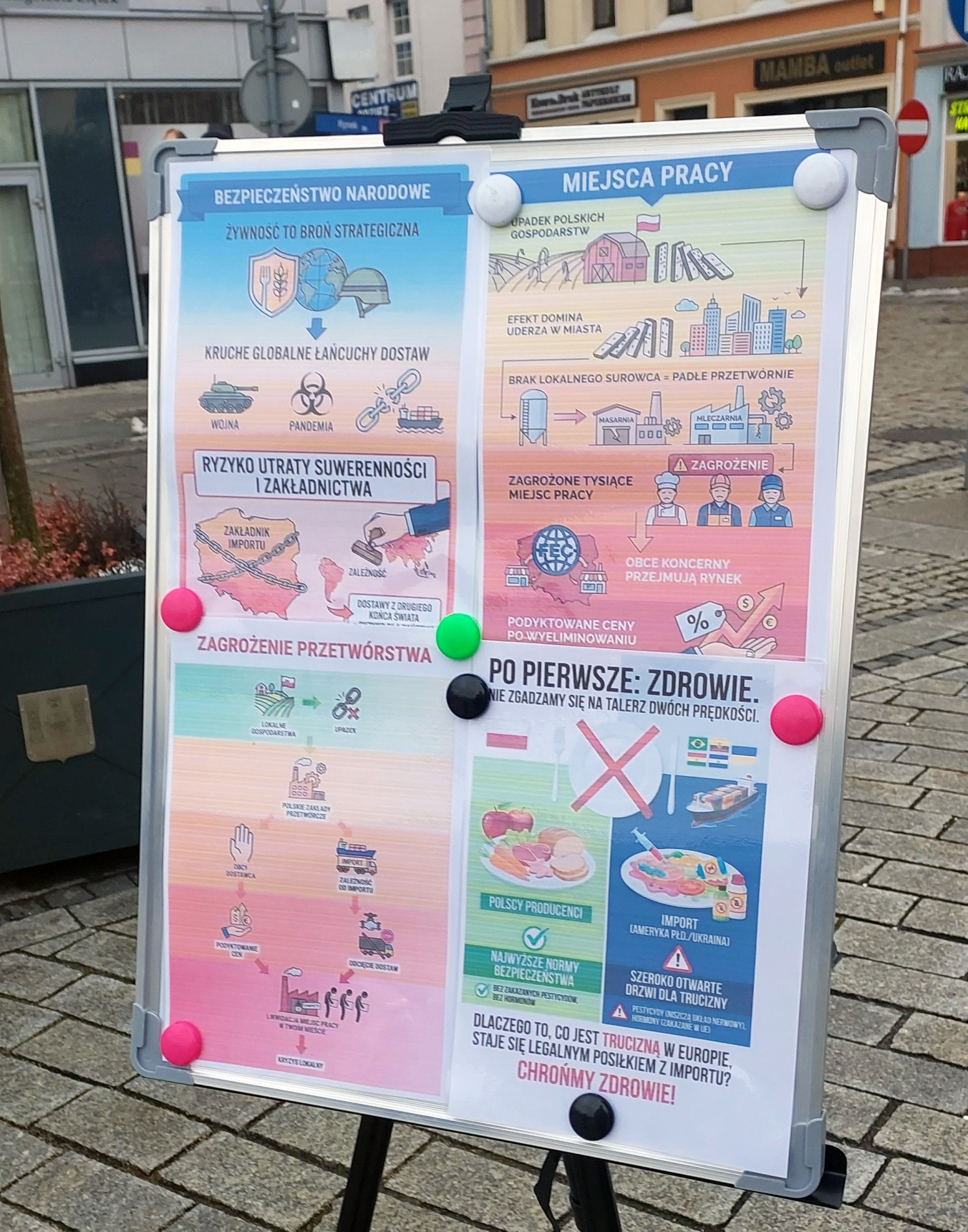 Działacz wskazywał także na kwestie zdrowotne. Przypominał, że w części krajów, z których trafia do Europy żywność, używa się pestycydów i hormonów zakazanych w UE, które mogą mieć negatywny wpływ na zdrowie, w tym – jak mówił – przyczyniać się do rozwoju nowotworów czy uszkodzeń płodu w łonie matki. Odwołał się przy tym do niedawnej decyzji parlamentu Francji, który wezwał swój rząd do zbudowania „mniejszości blokującej” wobec umowy Mercosur. – Dlatego wzywamy wszystkich posłów i europosłów z naszego regionu, żeby naciskali na rząd w Warszawie, by przyłączył się do Francuzów i spróbował zablokować tę szkodliwą umowę – mówił Majka.
