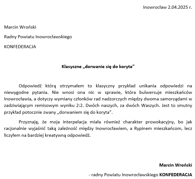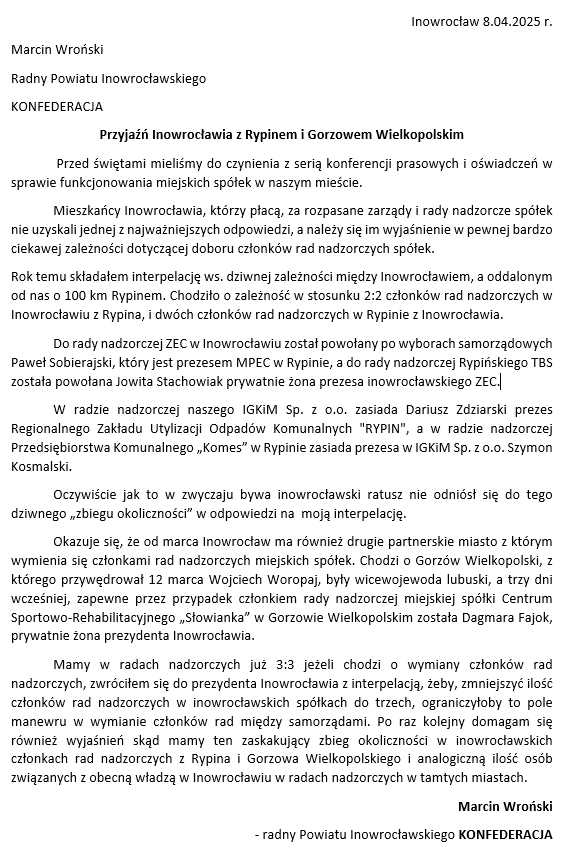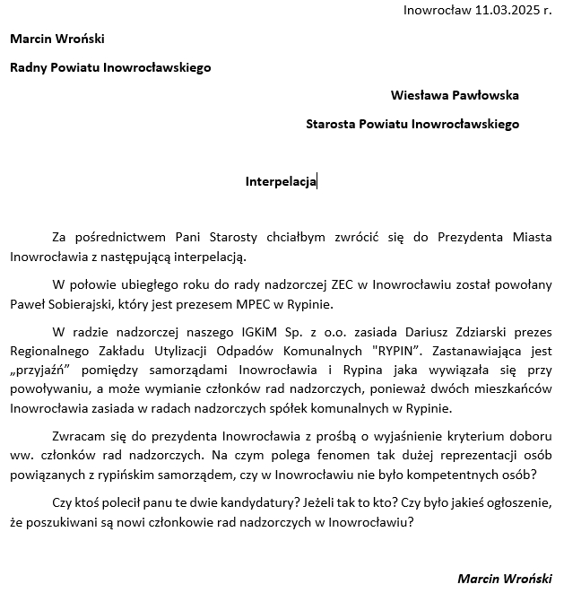Interpelacja radnego Marcina Wrońskiego i odpowiedź ratusza wywołały dyskusję o składzie rad nadzorczych miejskich spółek. W sprawie pojawiają się konkretne nazwiska oraz powiązania między samorządami. To temat dotyczący funkcjonowania spółek komunalnych i decyzji kadrowych. Poniżej publikujemy przesłane przez radnego pisma.