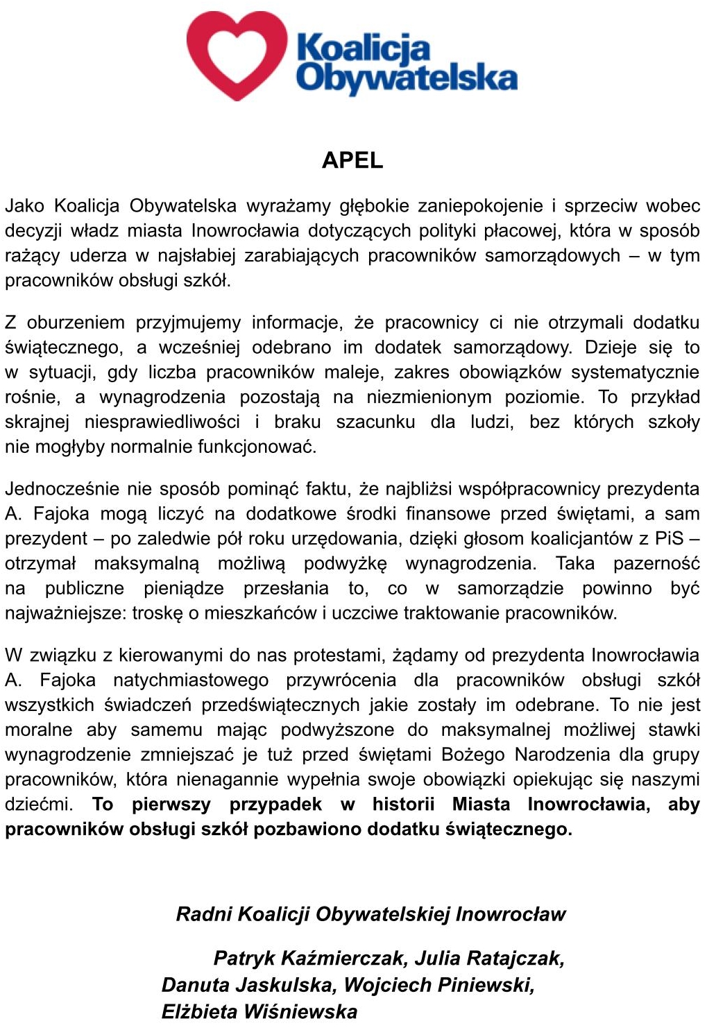 Radni Koalicji Obywatelskiej wystąpili z otwartym apelem do Prezydenta Miasta Inowrocławia o przywrócenie dodatku świątecznego najsłabiej zarabiającym pracownikom samorządowym. Zdaniem radnych to przykład skrajnej niesprawiedliwości.