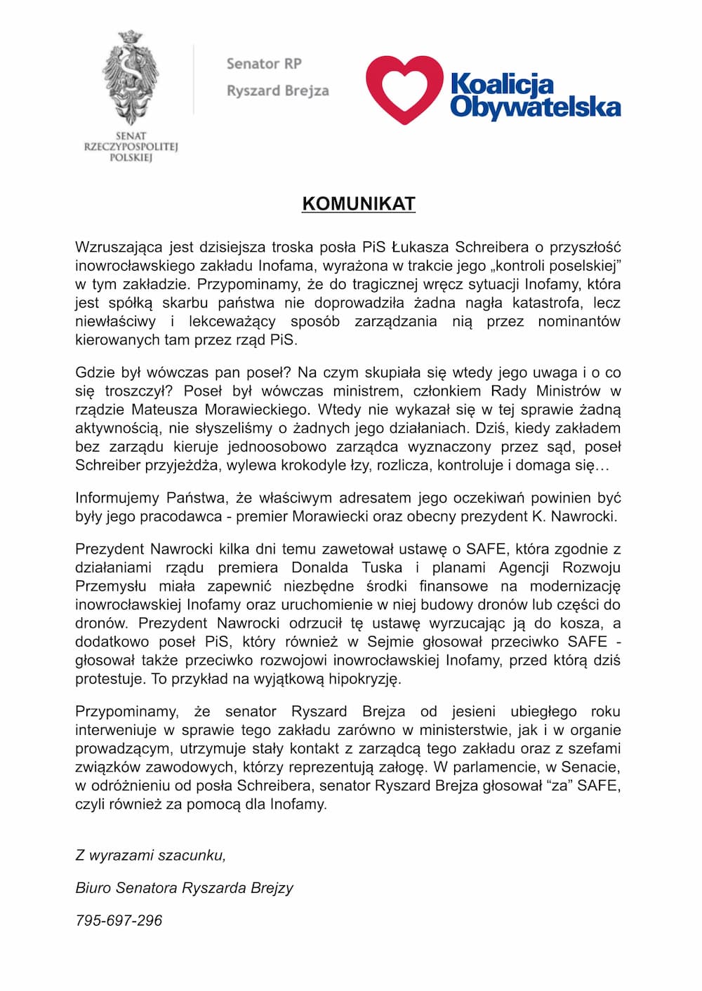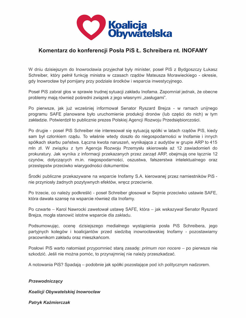 Po dzisiejszej konferencji prasowej posła Łukasza Schreibera do kontry przeszli działacze Koalicji Obywatelskiej. Zarówno senator Ryszard Brejza, jak i radny Patryk Kaźmierczak, nie zostawiają suchej nitki na parlamentarzyście Prawa i Sprawiedliwości. Poniżej publikujemy oświadczenia obu polityków.