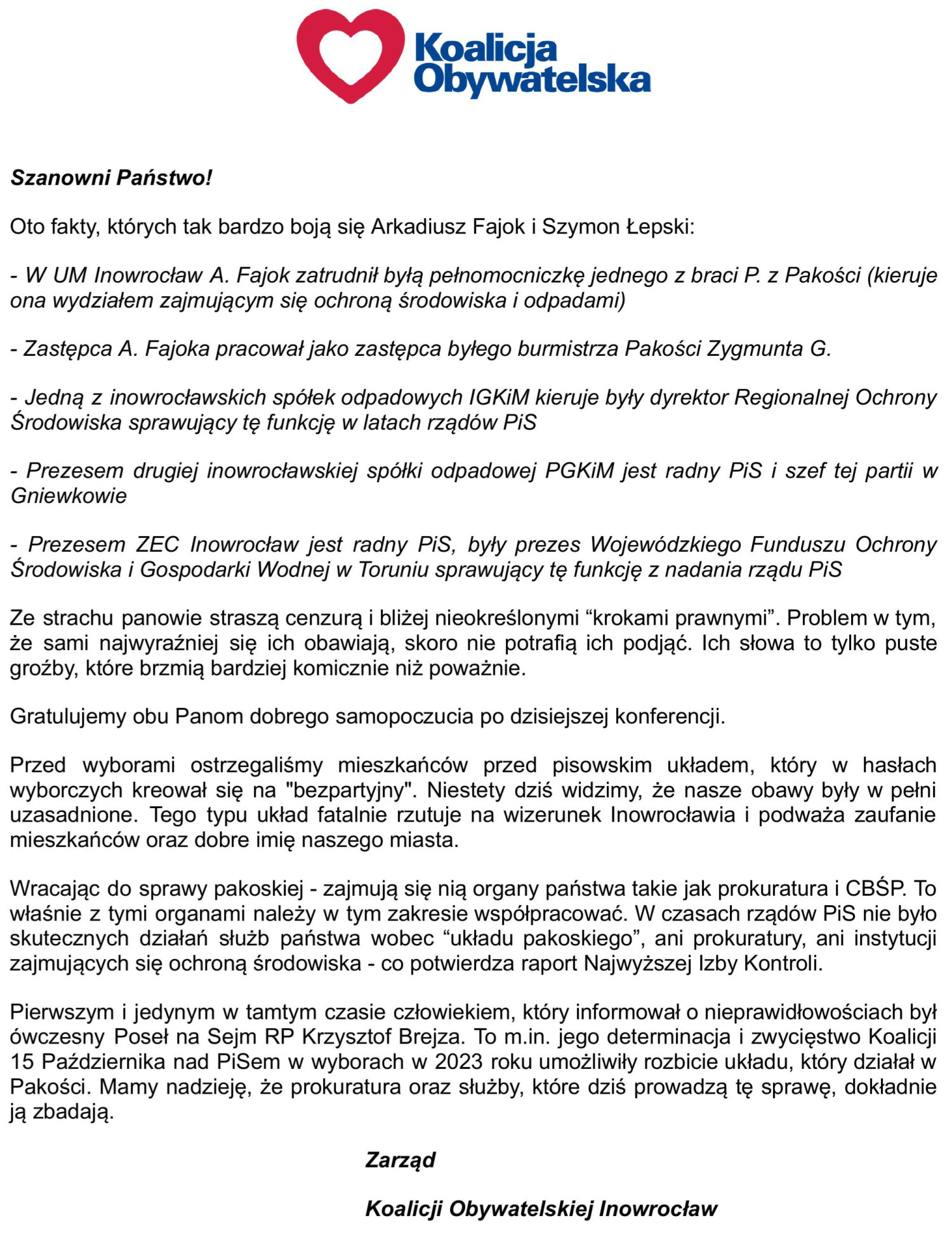 Lokalni działacze Koalicji Obywatelskiej, w wydanym oświadczeniu, odnieśli się do dzisiejszej konferencji prasowej prezydenta Inowrocławia i jego zastępcy. Poniżej publikujemy treść tego pisma.