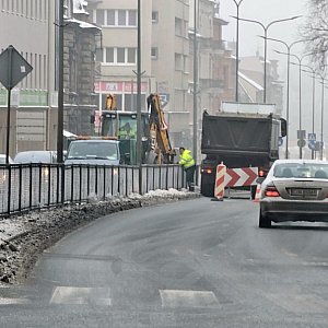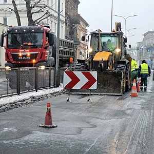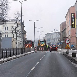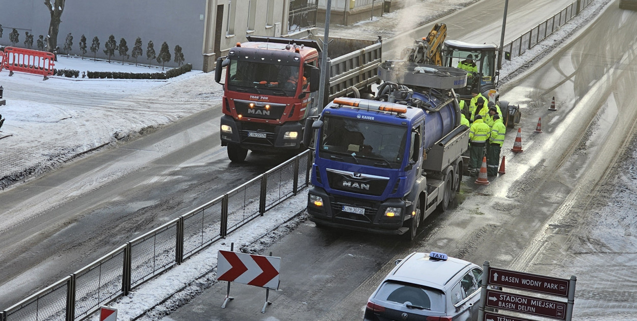 Zarówno w stronę centrum miasta, jak i w kierunku dworca kolejowego z ruchu wyłączony jest lewy pas na odcinku kilkunastu metrów. Ekipa wodociągów zerwała nawierzchnię i trwa robienie wykopu. Na jezdni jest sporych rozmiarów kałuża zamarzniętej wody z wycieku.