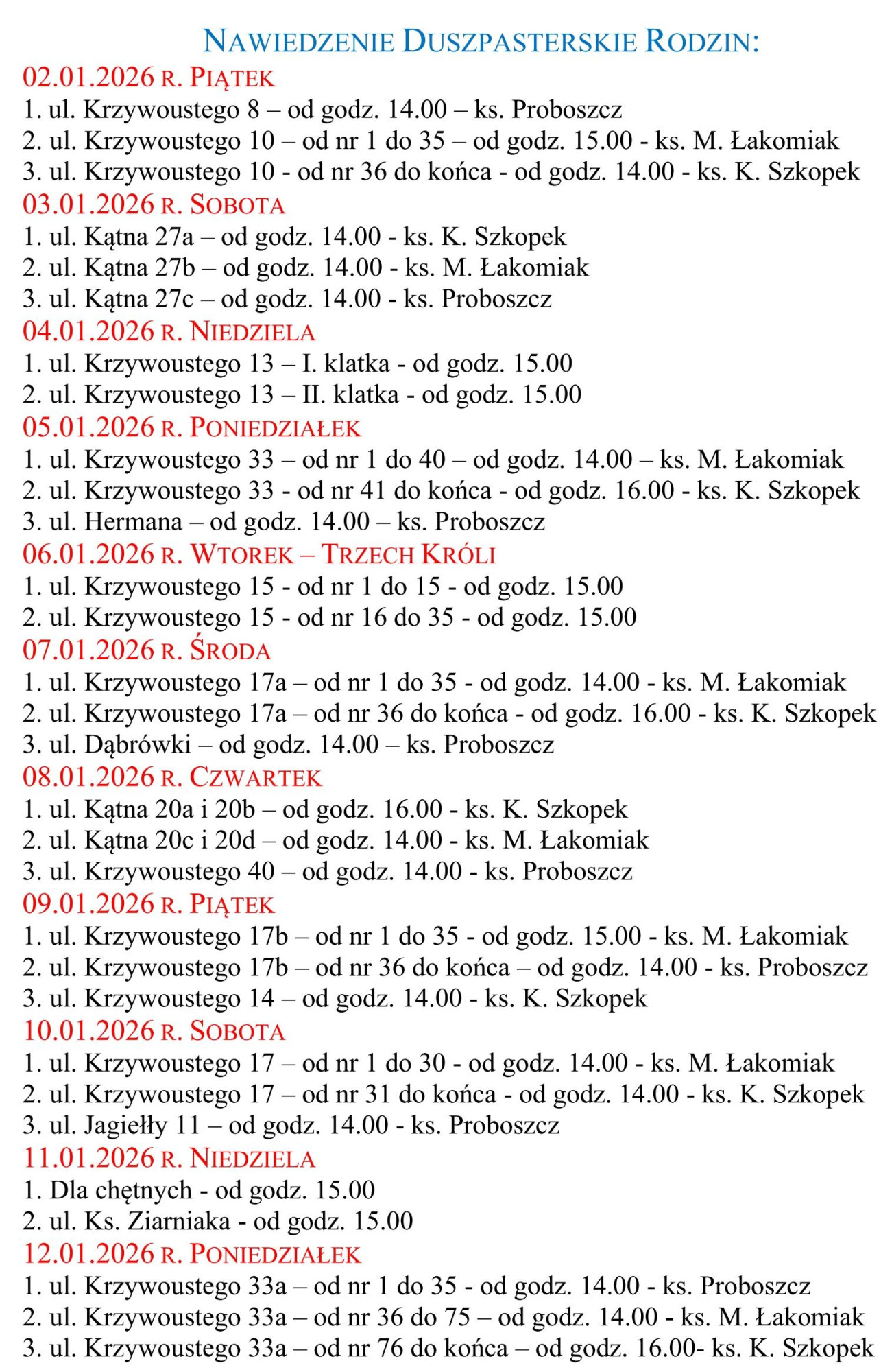 30 grudnia, godz. 10:00, Przedbojewice 1, 2, 3, 28; następnie strona rzeki; dalej 11 oraz 5, 6, 8 itd. zgodnie z kierunkiem jazdy, zakończenie u P. Nowak