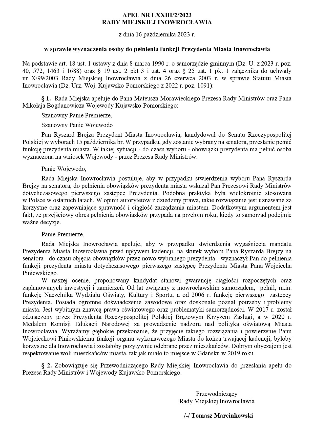 Decyzję w tej sprawie skomentował Marcin Wroński, który przypomniał, że nie ma jeszcze ostatecznych wyników w sprawie objęcia mandatu. Za apelem zagłosowało 17 inowrocławskich radnych. Dzisiaj (16.10) informowaliśmy również o odwołaniu Ewy Koman ze stanowiska wiceprezydenta.