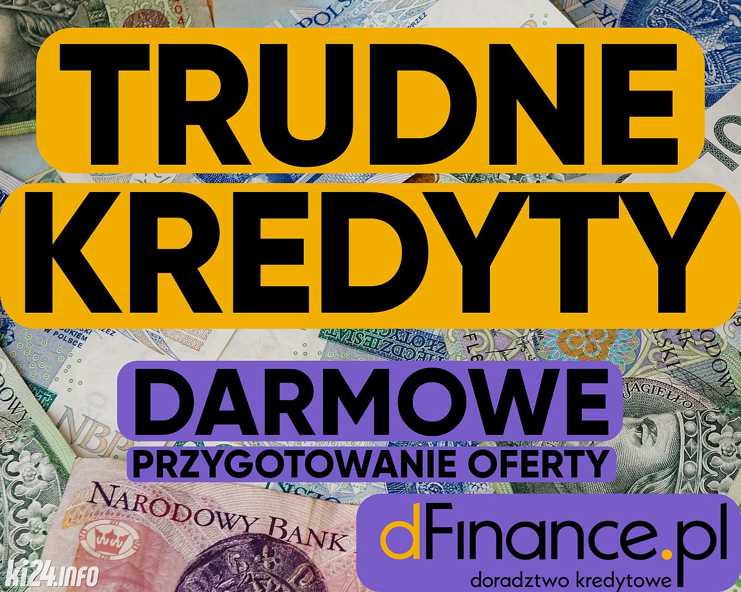 Biuro pośrednictwa kredytowego dFinance.pl, z wieloletnim doświadczeniem na polskim rynku, oferuje pełen zakres finansowania bankowego. Osoby fizyczne - kredyty gotówkowe i konsolidacyjne: pomimo problemów pojawiających się u klientów. Radzimy sobie z takimi przeszkodami jak: - terminowe umowy zlecenia - brak udokumentowanego dochodu (kredyty na oświadczenie) - brak zgody małżonka (kredyty do kwot niewymagających zgody, maks. 100 tys zł.) - problemy ze spłatą kredytów w przeszłości - kredyty na podstawie świadczeń socjalnych - kredyty z brakiem zdolności kredytowej - duża liczba zapytań kredytowych Firmy, kredyty dla działalności: - kredyt pomimo przejściowych problemów z płynnością finansową, - kredyty dla wszelkich form rozliczeń (karta podatkowa, ryczałt, kpir) - kredyt na przychodzie - kredyt pomimo spadków dochodu Trudne Kredyty - Indywidualne podejście do klienta! Doradca diagnozuje problem i do sytuacji klienta dopasowujemy finansowanie. - Oprocentowanie kredytów już od 10,99 %, - Prowizja banku już od 0 %, - Okres kredytowania od 24 do 144 mieś. Masz jakieś pytania? Zapraszamy do kontaktu: [email protected] Tel. 537 166 839