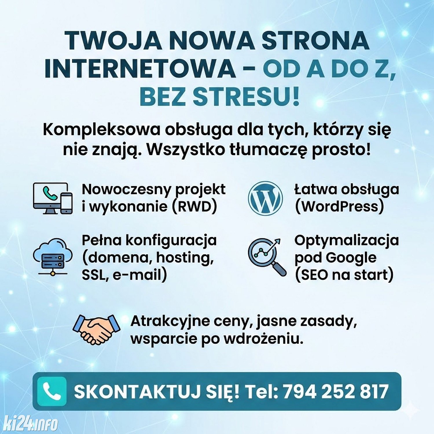 Wykonuję strony internetowe kompleksowo - od A do Z, czyli Ty zlecasz, a ja zajmuję się całą resztą. Wszystko tłumaczę prostym językiem i prowadzę Cię krok po kroku.