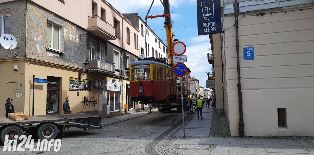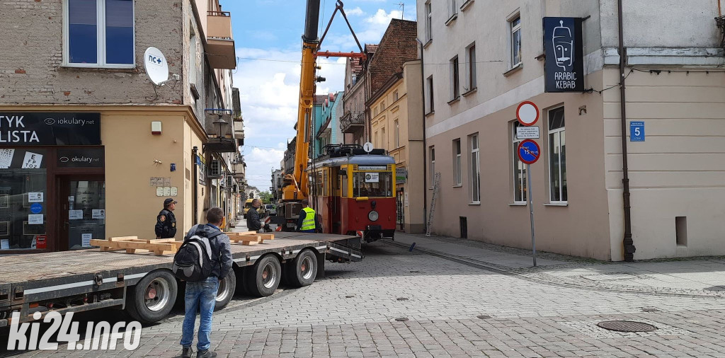 Znajdująca się w centrum Inowrocławia pamiątkowa bimba przejdzie renowację. Na czas kompleksowego remontu, zabytkowy wagonik znika z ul. św. Ducha. Właśnie trwa załadunek pojazdu na platformę transportową.